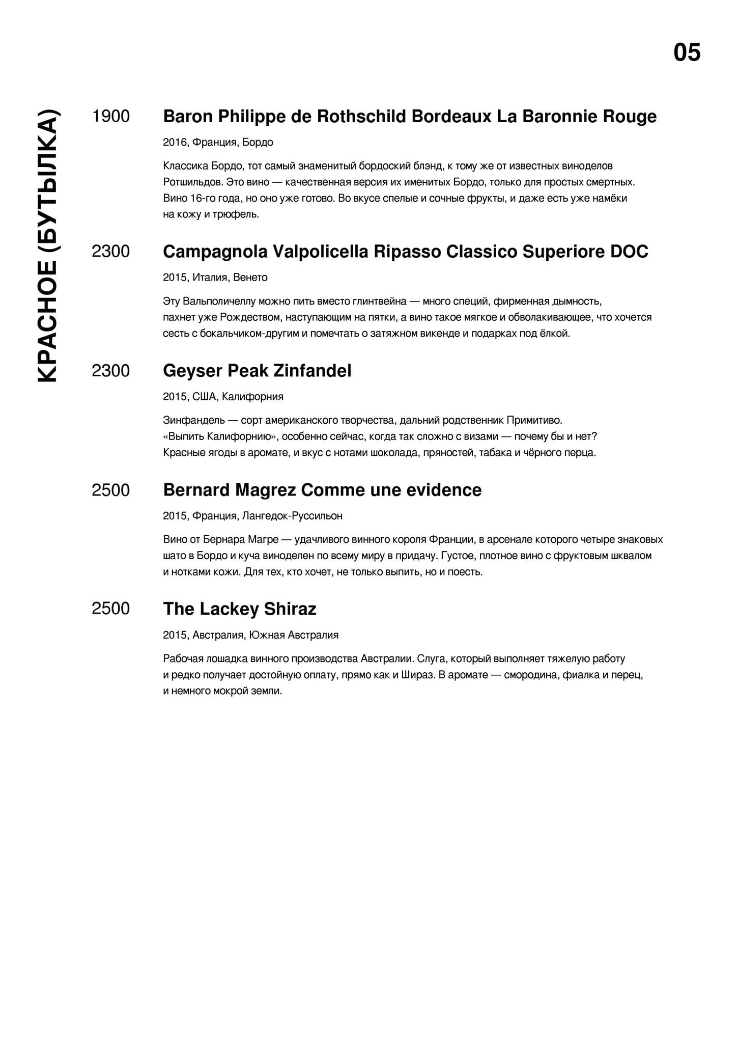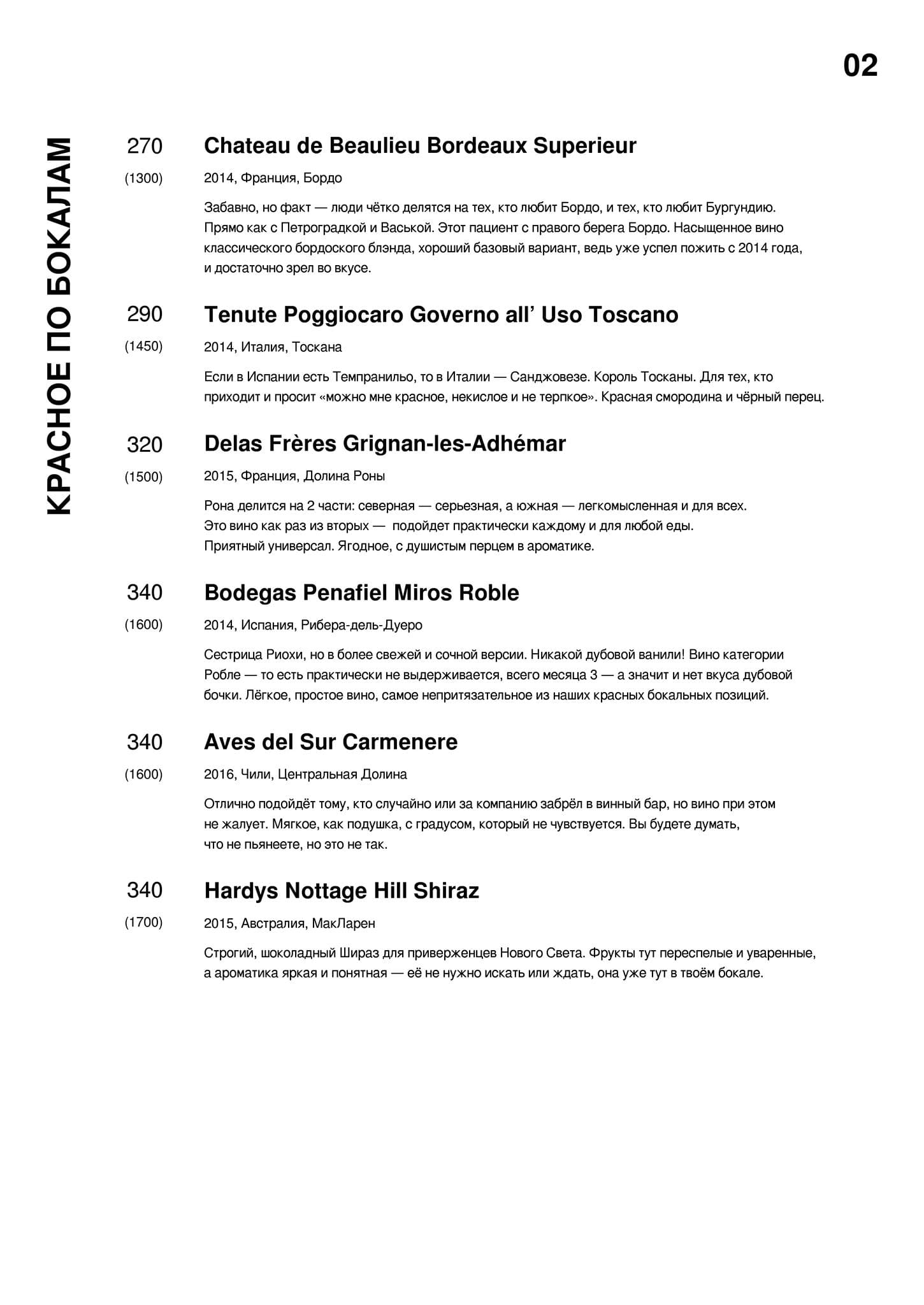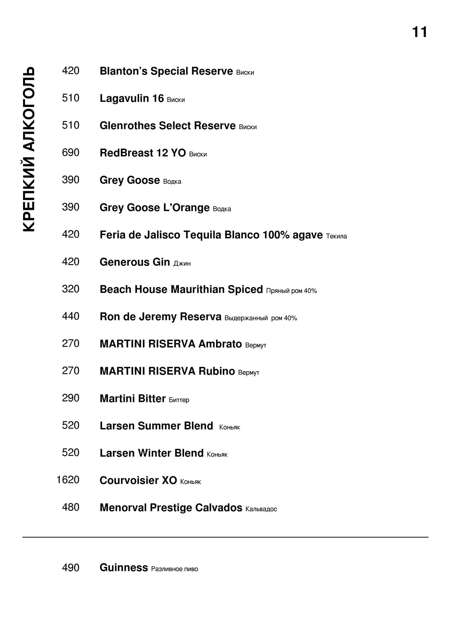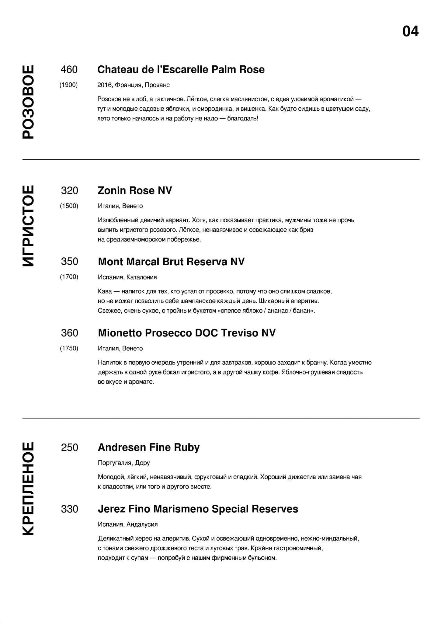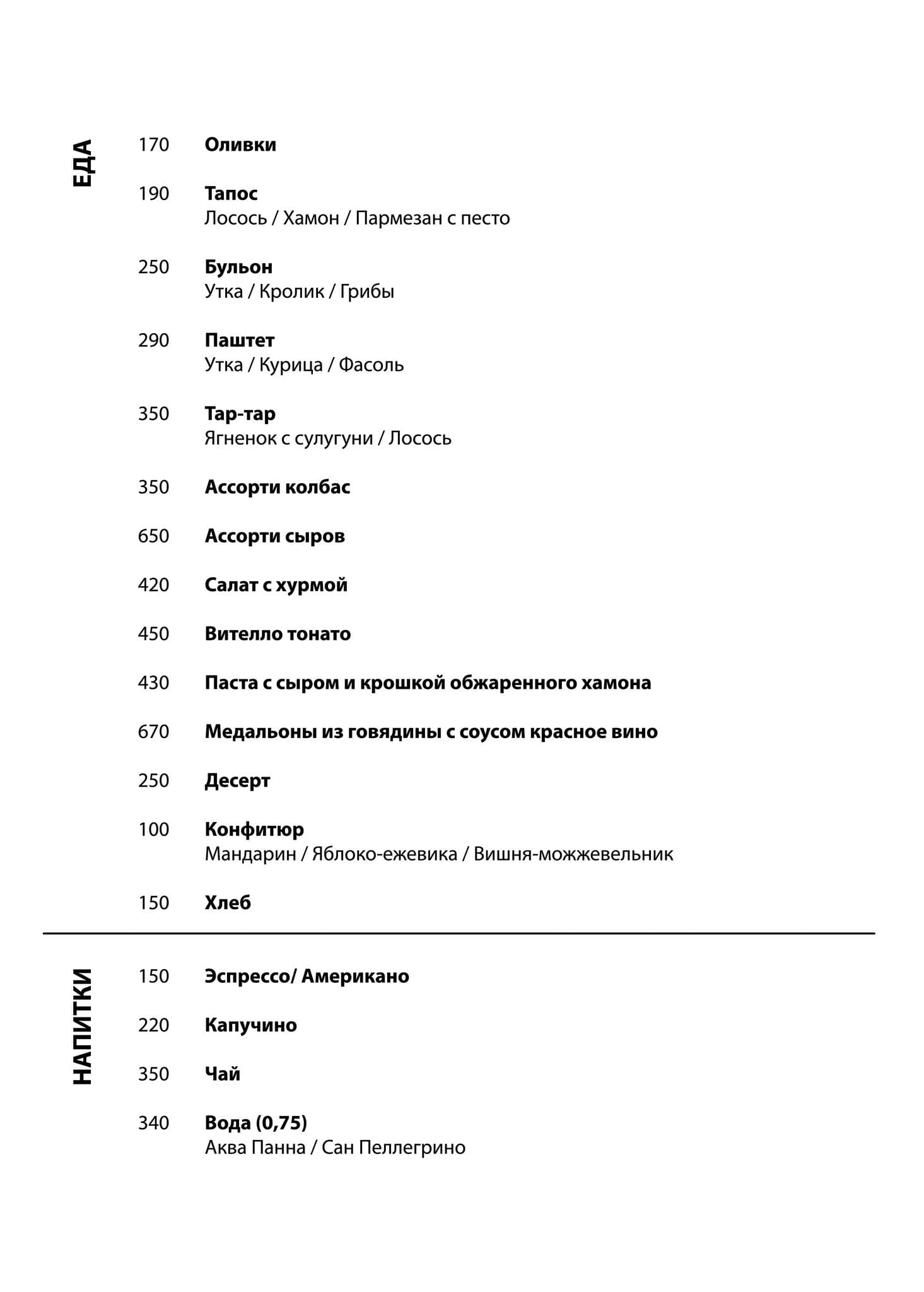 Меню закусок для проекта разработал шеф-повар Антон Абрезов (Gras x Madbaren), планируется, что в будущем он будет участвовать и в обновлениях меню. В закусках — тартары, сыры, паштеты с конфитюрами (по выходным добавляют террины), а после бурных выходных хорошо хлопнуть бокал крепкого целебного бульона — утиного, грибного и из кролика. Из общей картины здешнего человеколюбия разве что порой выбиваются цены: английский пудинг за 350 р. удивляет своими крошечными размерами, а единственная некрепкая альтернатива вину — знаменитый ирландский стаут — стоит целых 490 р. за пинту.