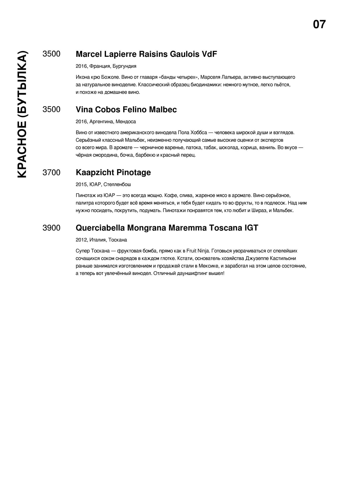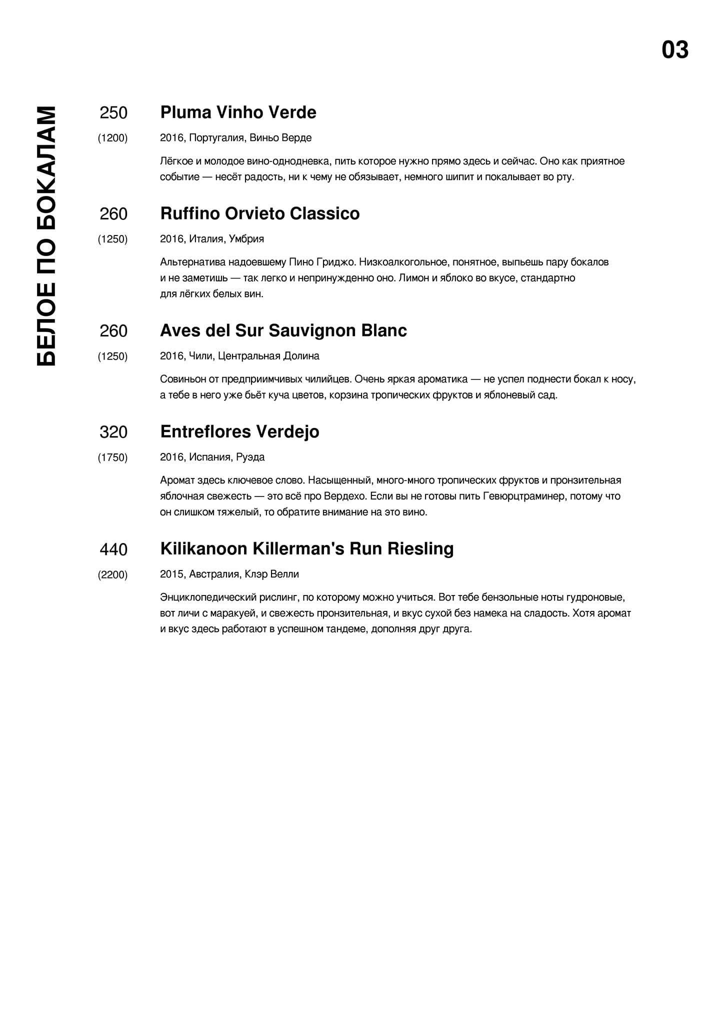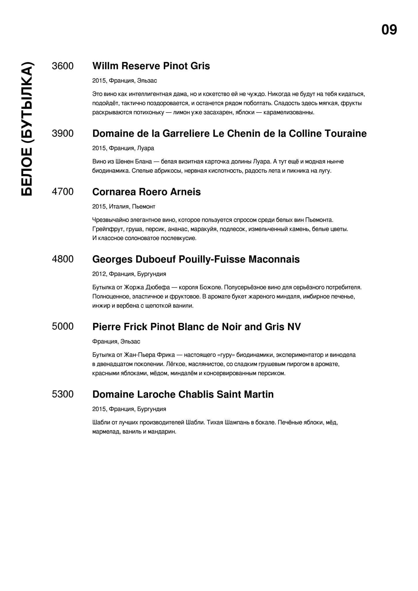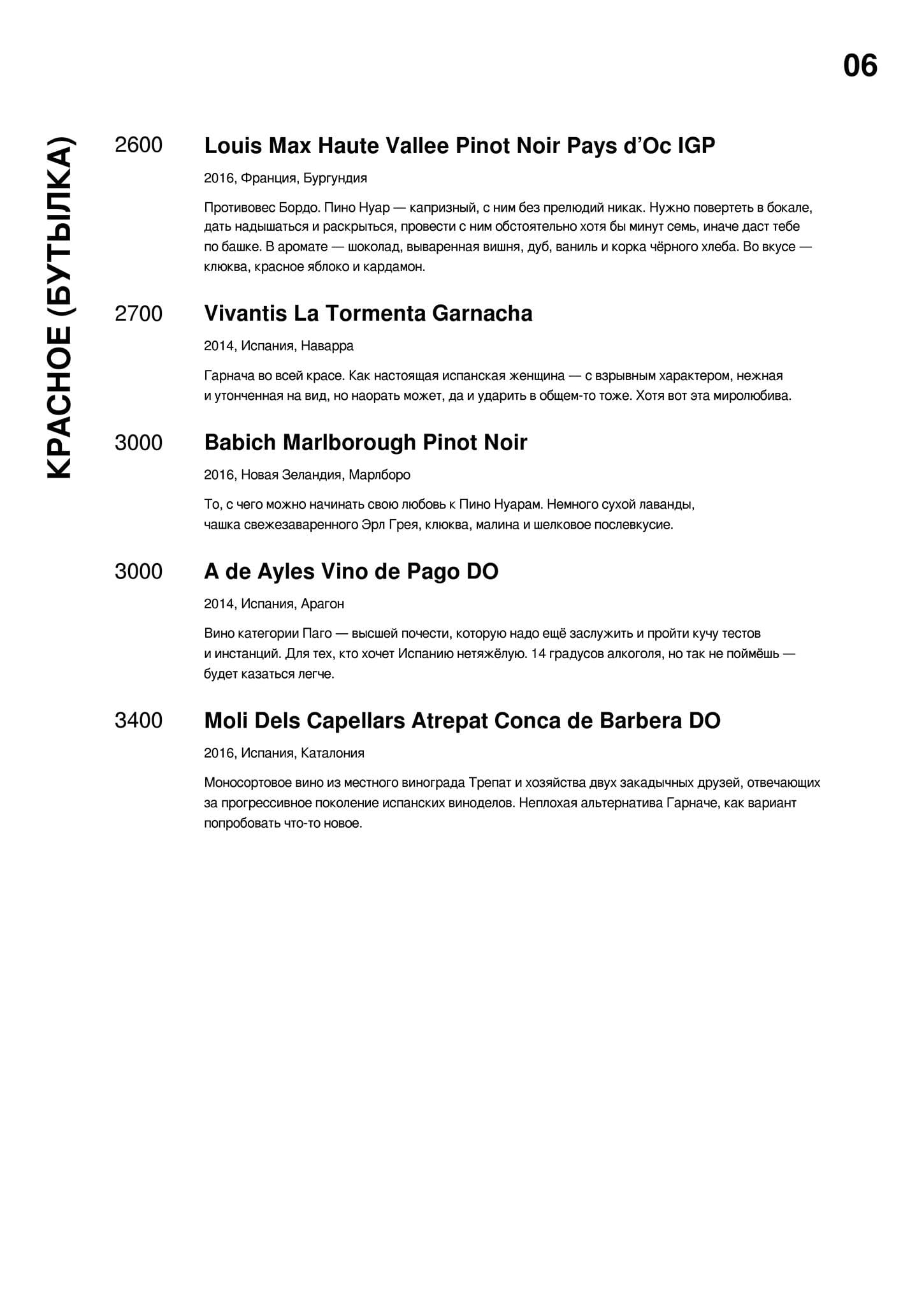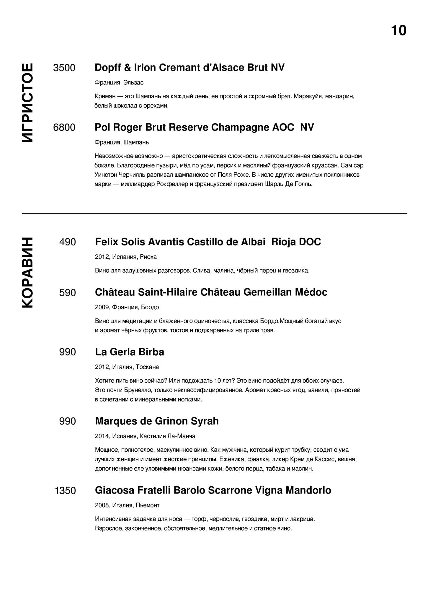 Меню закусок для проекта разработал шеф-повар Антон Абрезов (Gras x Madbaren), планируется, что в будущем он будет участвовать и в обновлениях меню. В закусках — тартары, сыры, паштеты с конфитюрами (по выходным добавляют террины), а после бурных выходных хорошо хлопнуть бокал крепкого целебного бульона — утиного, грибного и из кролика. Из общей картины здешнего человеколюбия разве что порой выбиваются цены: английский пудинг за 350 р. удивляет своими крошечными размерами, а единственная некрепкая альтернатива вину — знаменитый ирландский стаут — стоит целых 490 р. за пинту.