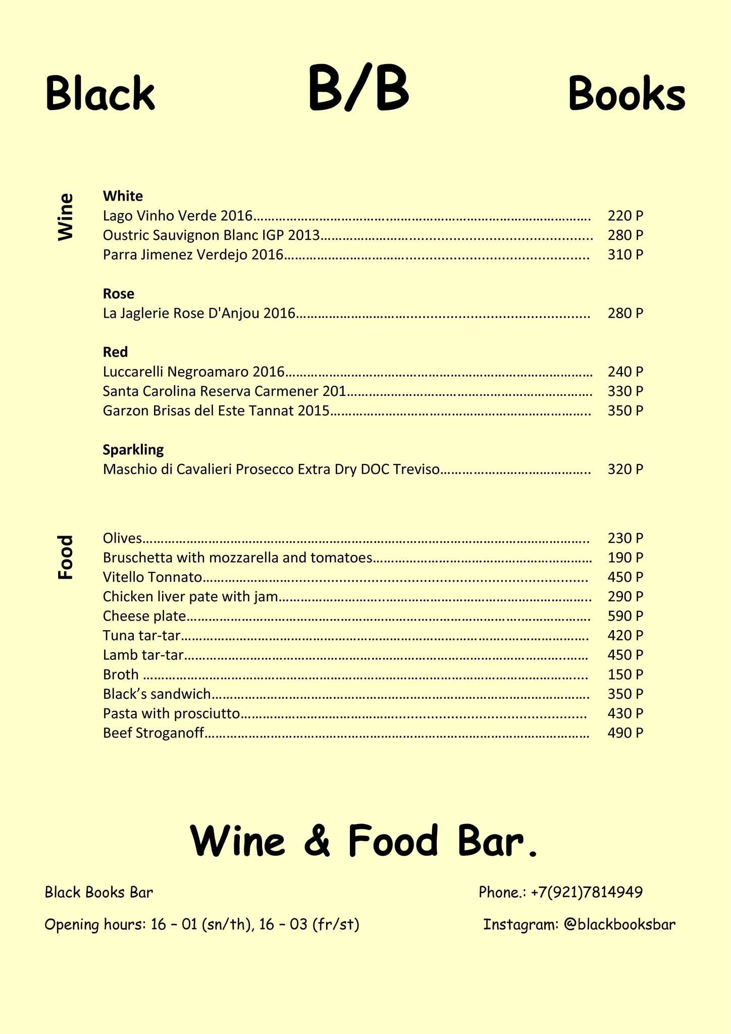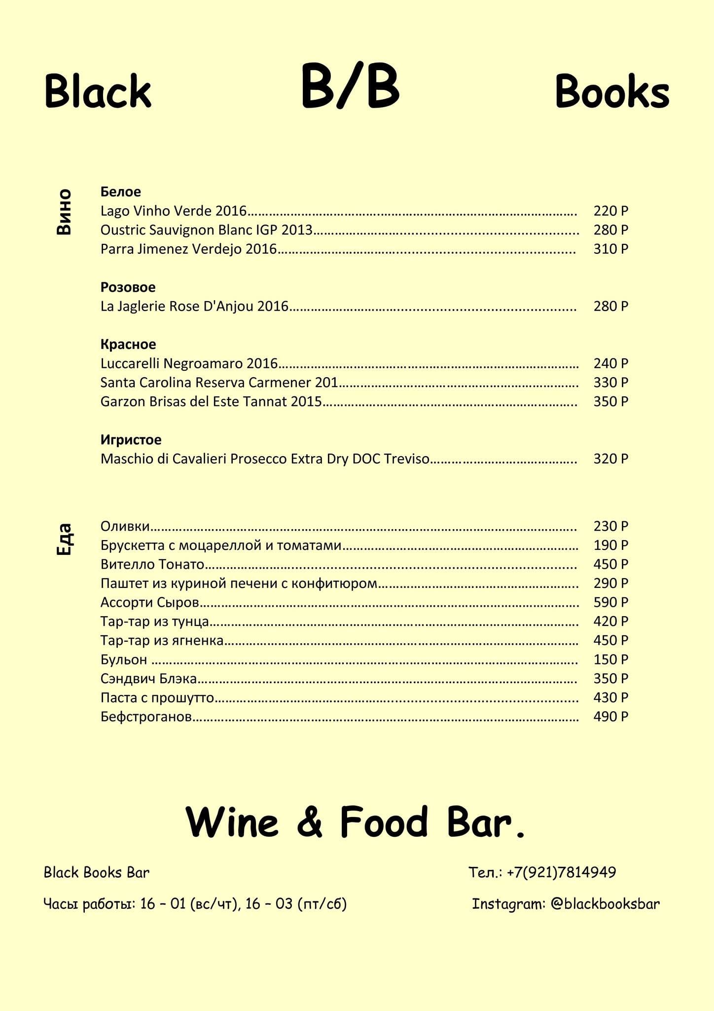 Сомелье Софья Анисимова создала для Black Books уникальную винную карту: брошюра на 50 позиций называется «Если вы не хотите разговаривать с официантом» и действительно позволяет выбрать подходящее вино без сторонней помощи. Каждое непонятное название сопровождает комментарий об аромате и вкусе, о сочетании с едой и подходящем случае. В меню представлены традиционное английское пиво, яблочно-грушевое просекко. Также предусмотрена небольшая линейка крепкого алкоголя и английский Guinness. В меню предложены наваристые домашние бульоны (разливают в бокалы), тартары из ягненка и из лосося, паштеты из утки, курицы и из фасоли, тапасы и пара горячих блюд. По выходным в духе английских традиций подают ветчину, выдержанную в маринаде в течение недели и томленую в Big Green Egg, со свежеиспеченным хлебом.